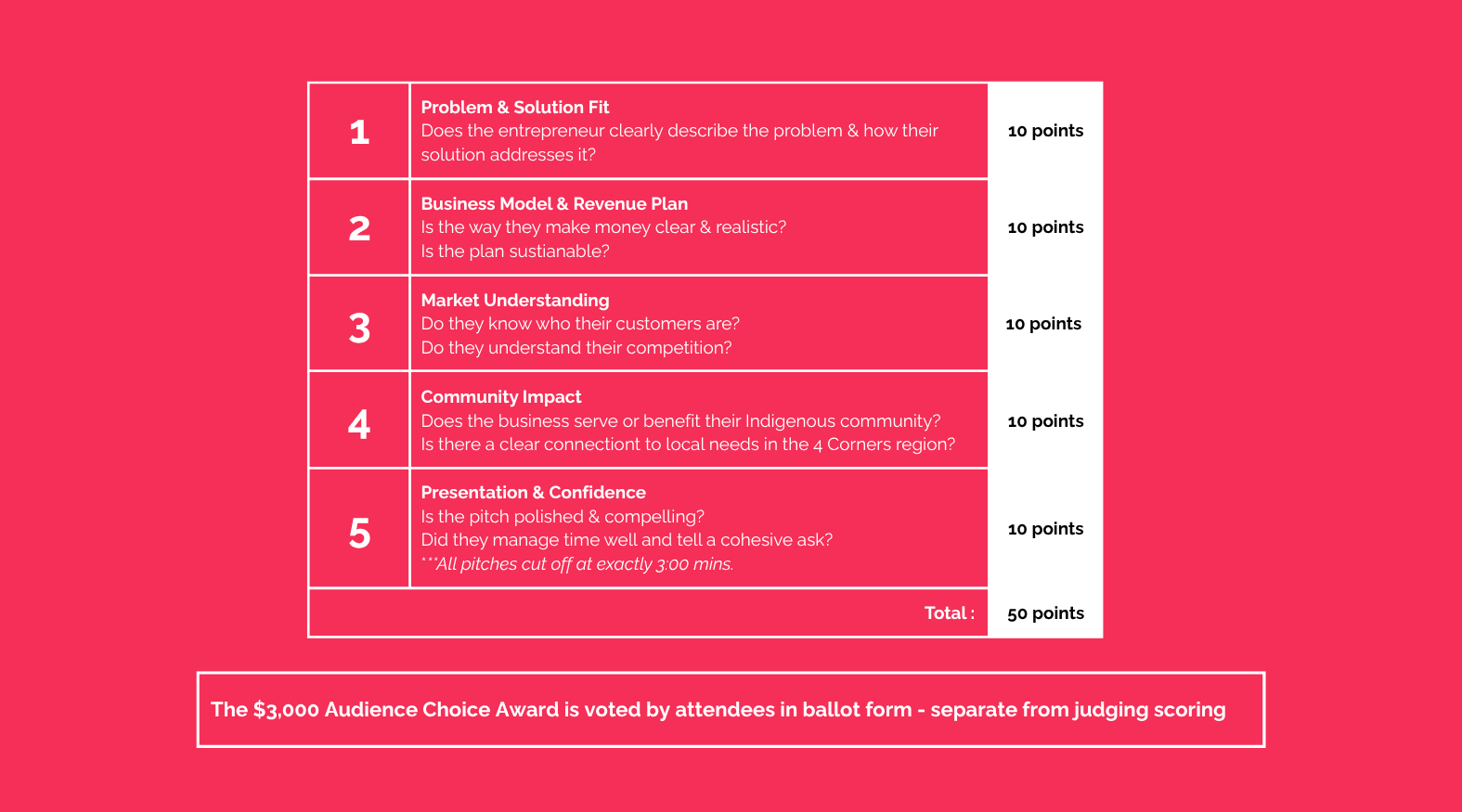 A Panel of 3 Guest Judges score each pitch across 5 categories for a total of 50 points. All Judges’ decisions are final.